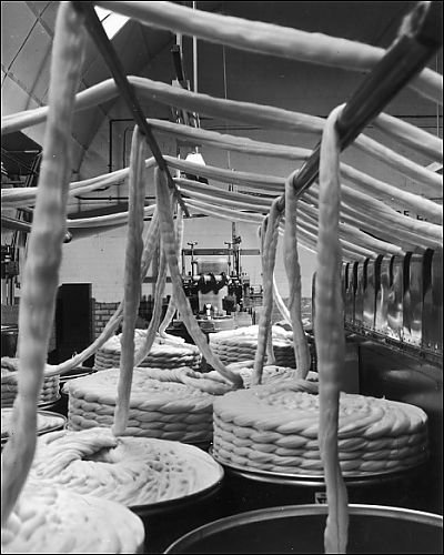 - Image Description: Immense coils of knitting wool are fed into spinning and processing machinery from vast round tubs. The factory of Patons a Baldwins, Darlington. Photograph by Heinz Zinram.